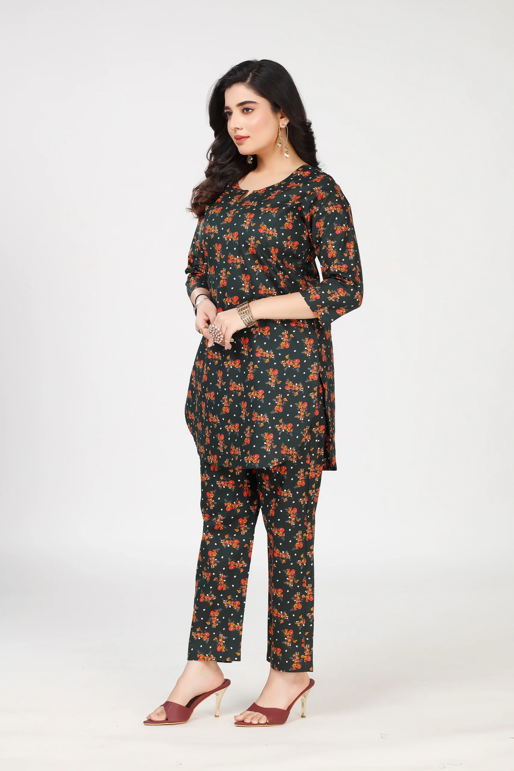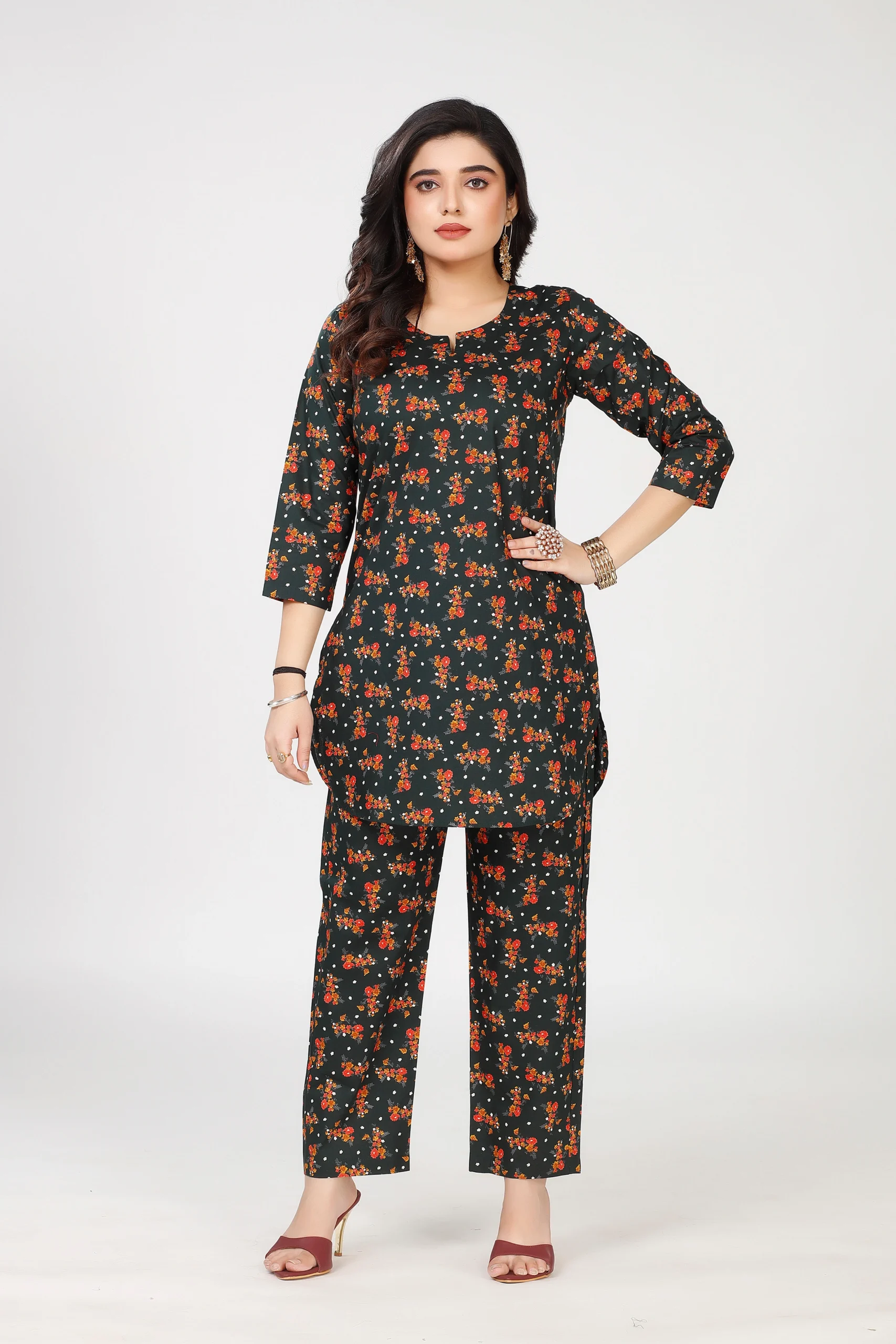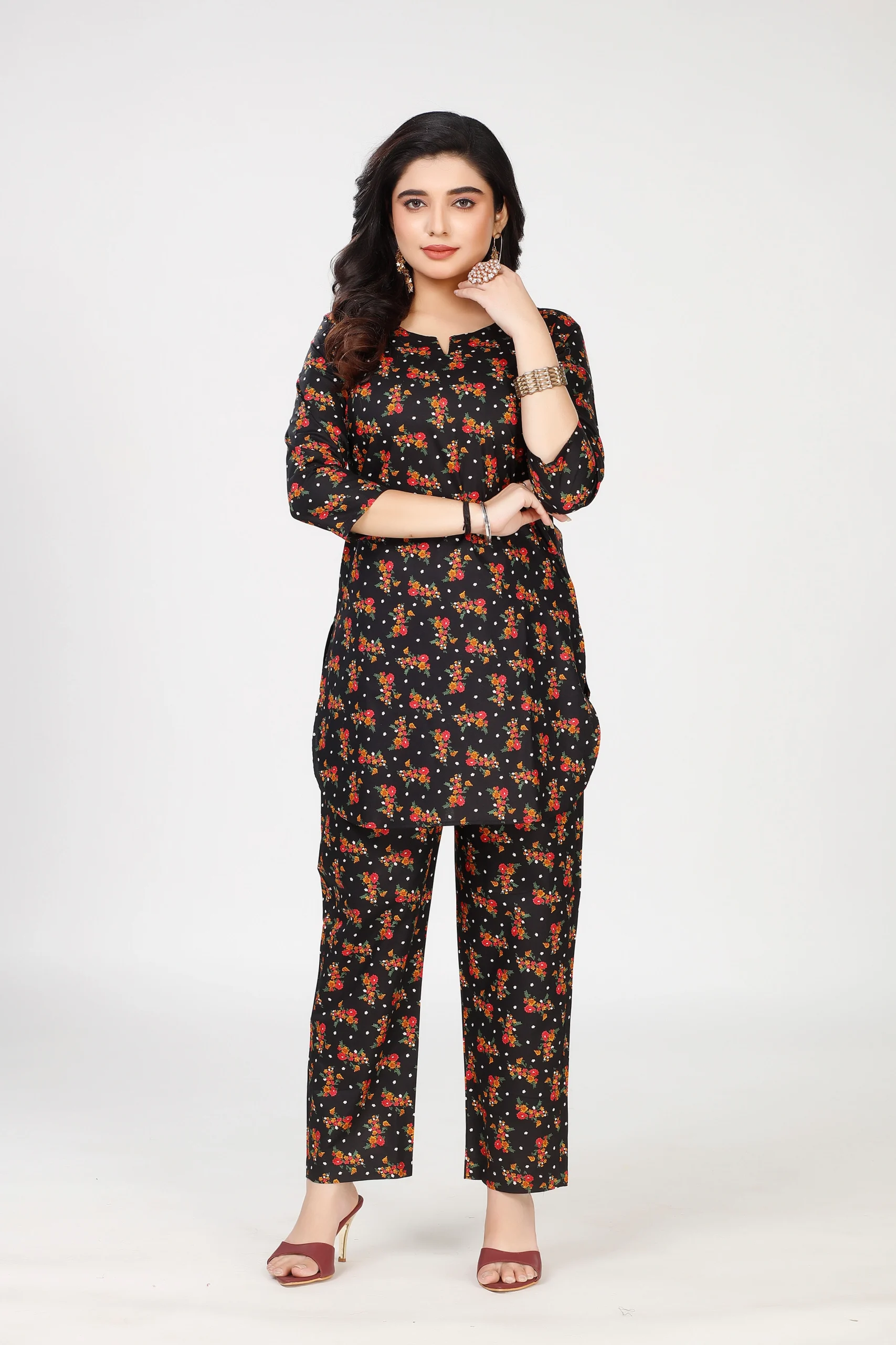 This premium cotton co-ord set features an all-over multicolor floral print and includes both the upper tunic and matching pant together.