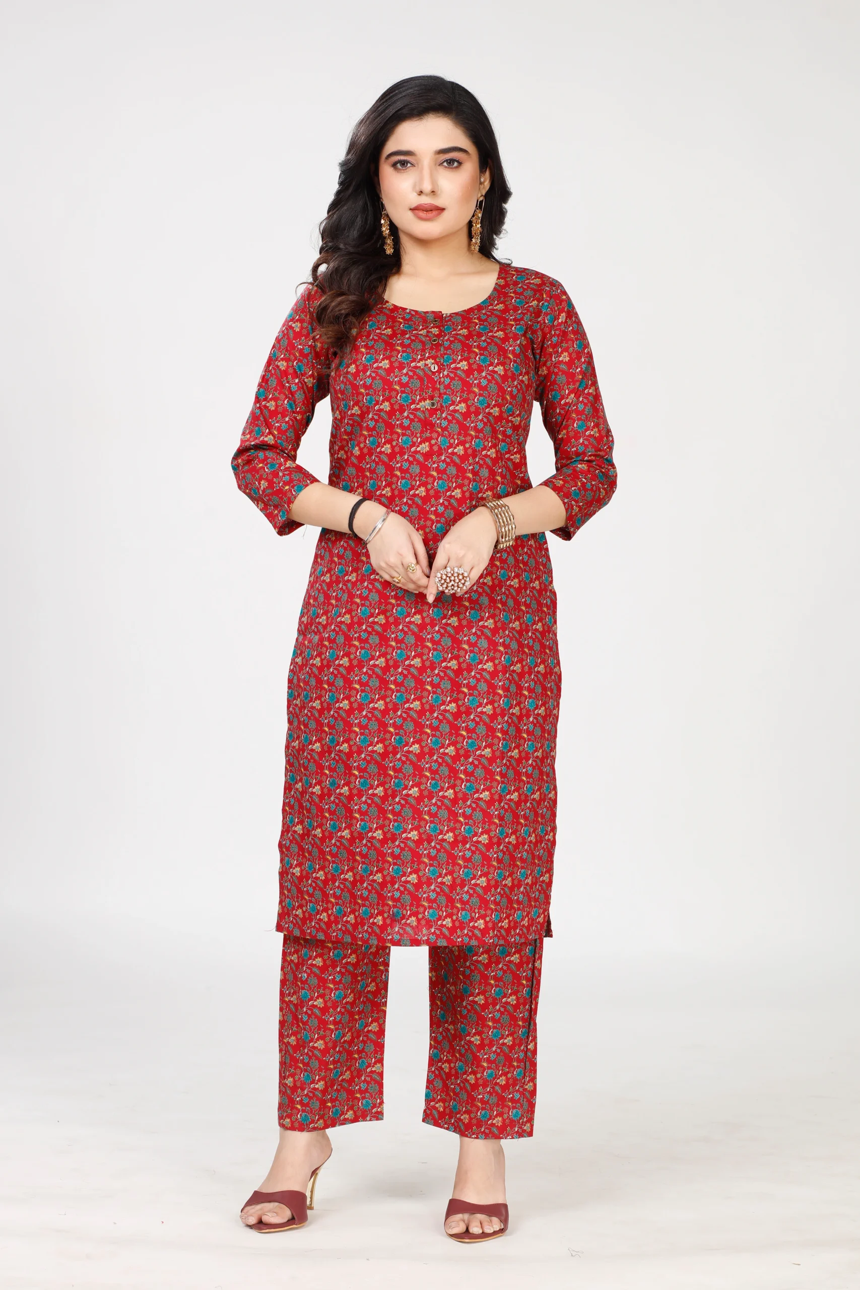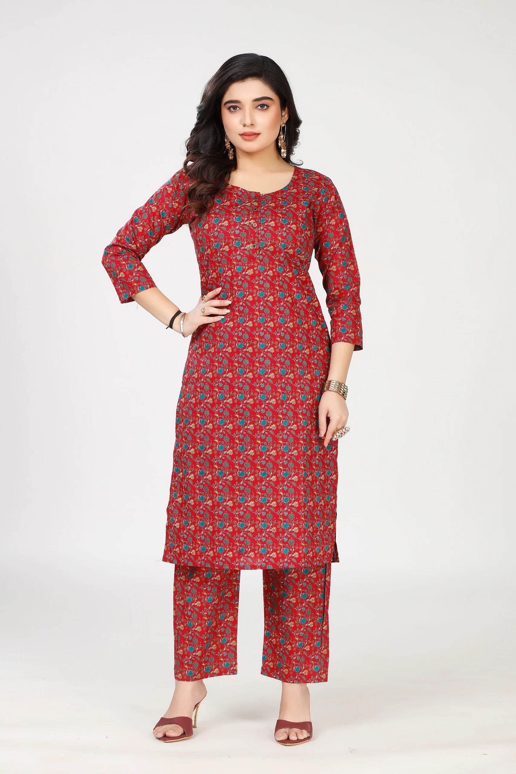 Beautiful red floral printed kurti palazzo set with soft & breathable fabric. Daily wear, office aur festive occasions ke liye perfect choice.